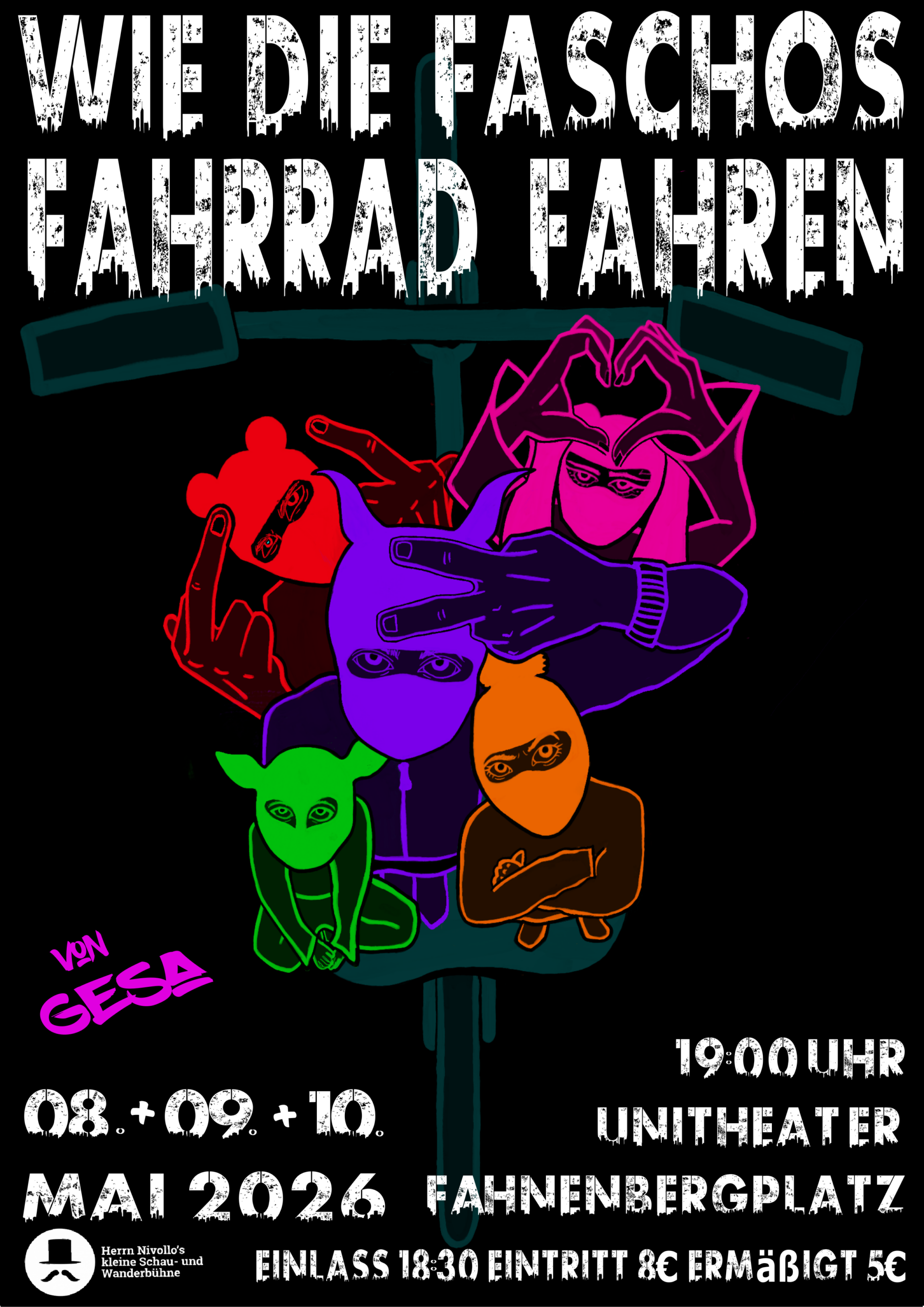 Am 8., 9. und 10. Mai spielen wir um jeweils 19:00 Wie die Faschos Fahrrad fahren von Gesa Höhn.
